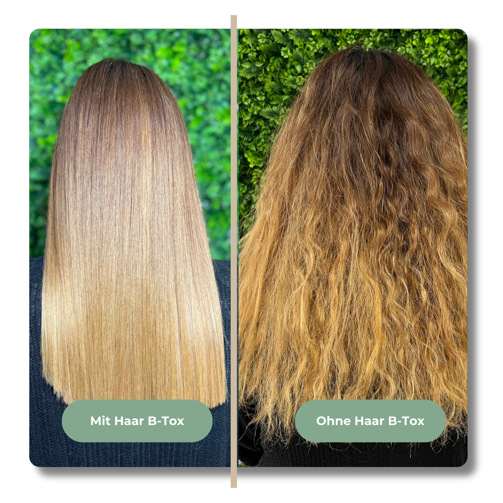 Unser Vorher-Nachher-Bild nach nur einer Anwendung zeigt die beeindruckende Wirkung unserer Haarb-tox-therapie.